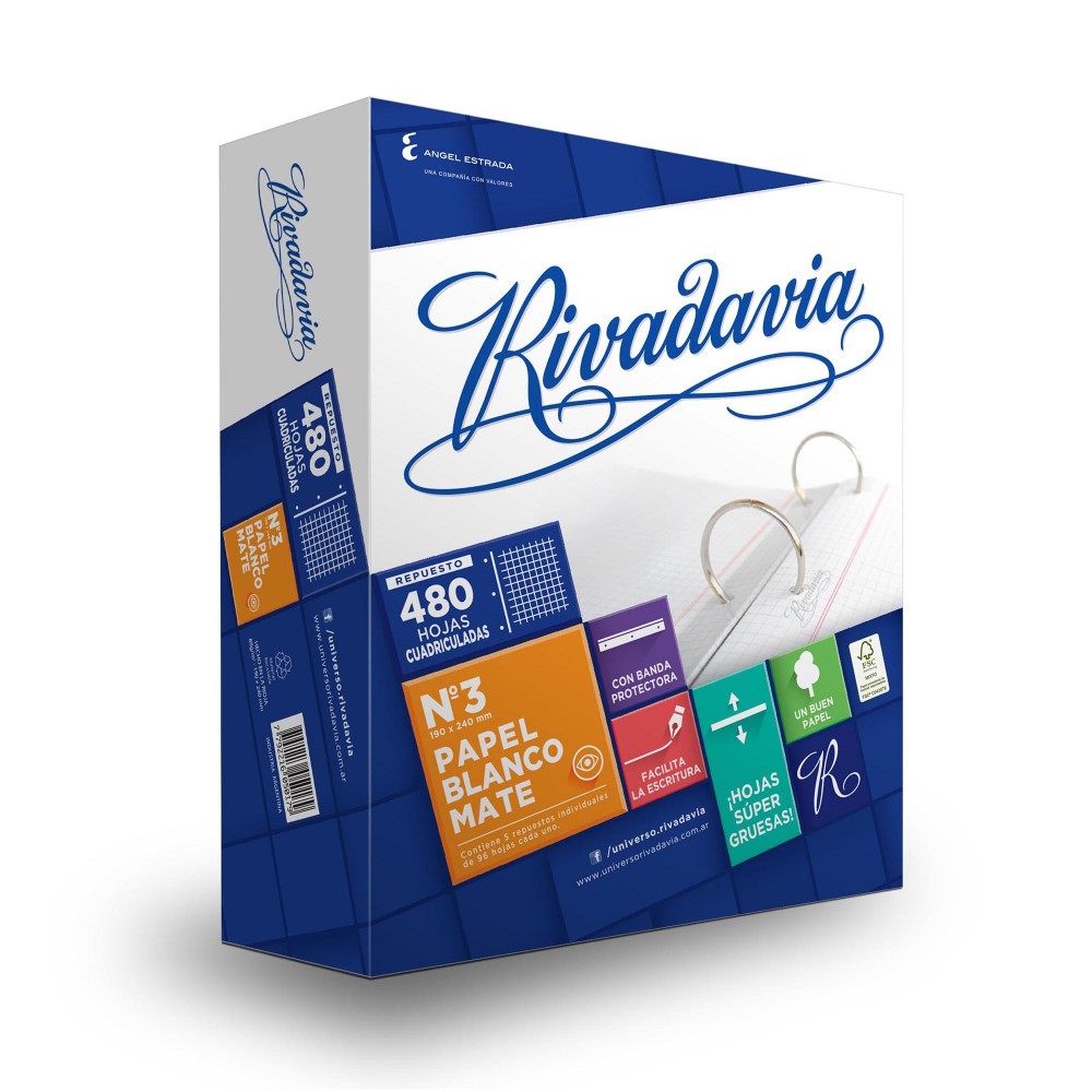 Repuesto Rivadavia con banda protectora. Blanco mate no refleja los rayos UV y no cansa la vista. Su alto gramaje permite borrar y corregir sin perder la calidad.